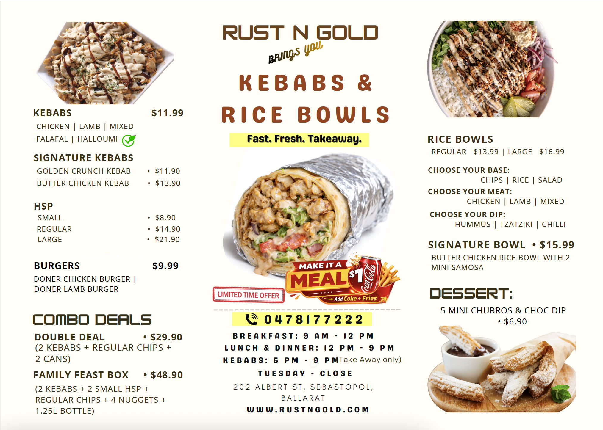 Nestled in the heart of Sebastopol, Ballarat, Rust n Gold is more than a cafe — it's a gathering place where rich coffee meets hearty meals. From golden mornings with artisan brews to cozy evenings with chef-crafted mains, every visit is an experience worth savouring.