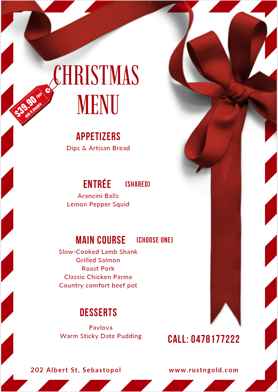 - Christmas 4-Course FeastCelebrate with our gourmet 4-course menu — $39.99 per person (min 6 people).$39.99